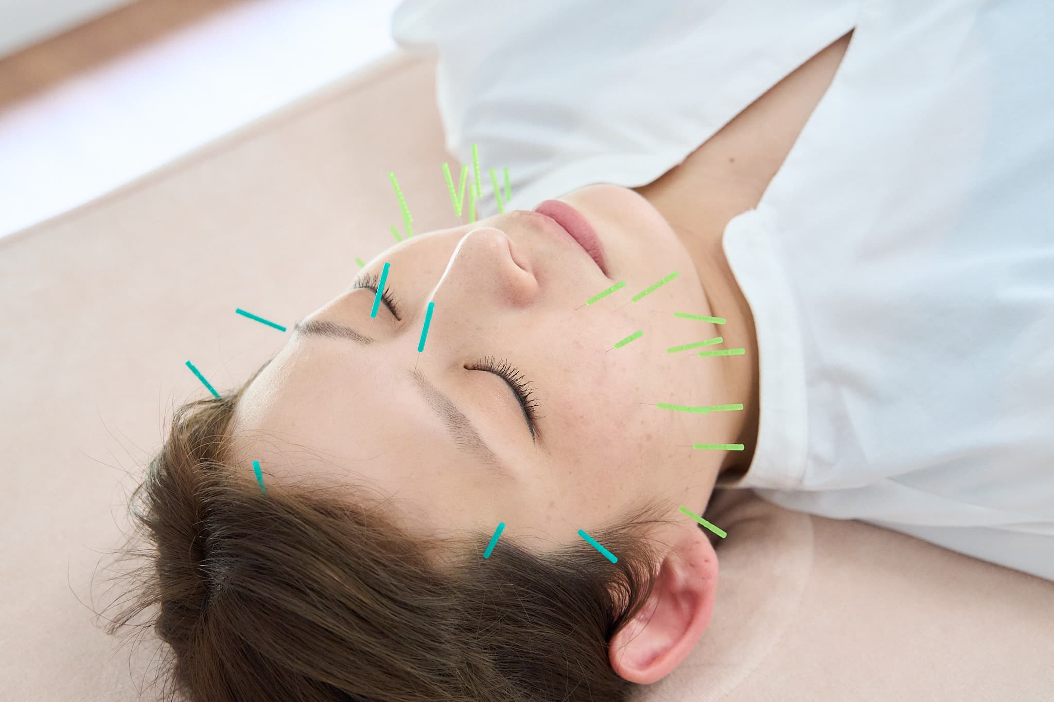 顔と体のツボに鍼を入れて血流と代謝を促進。リフトアップ・たるみ・くすみ改善を目指し、化粧ノリの良い素肌へ導きます。