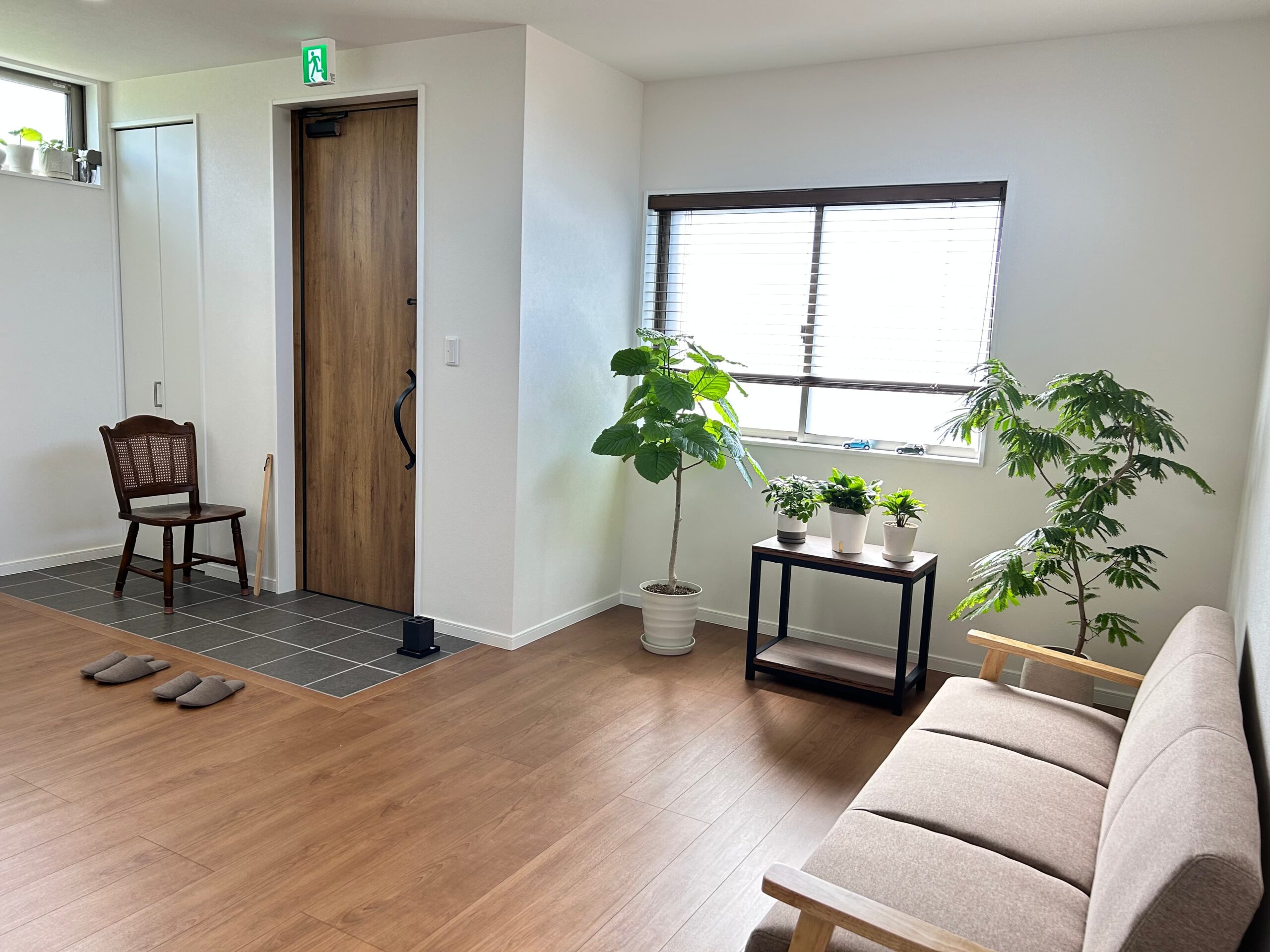新築の広々とした空間に、観葉植物の緑が彩る落ち着いたサロンです。
